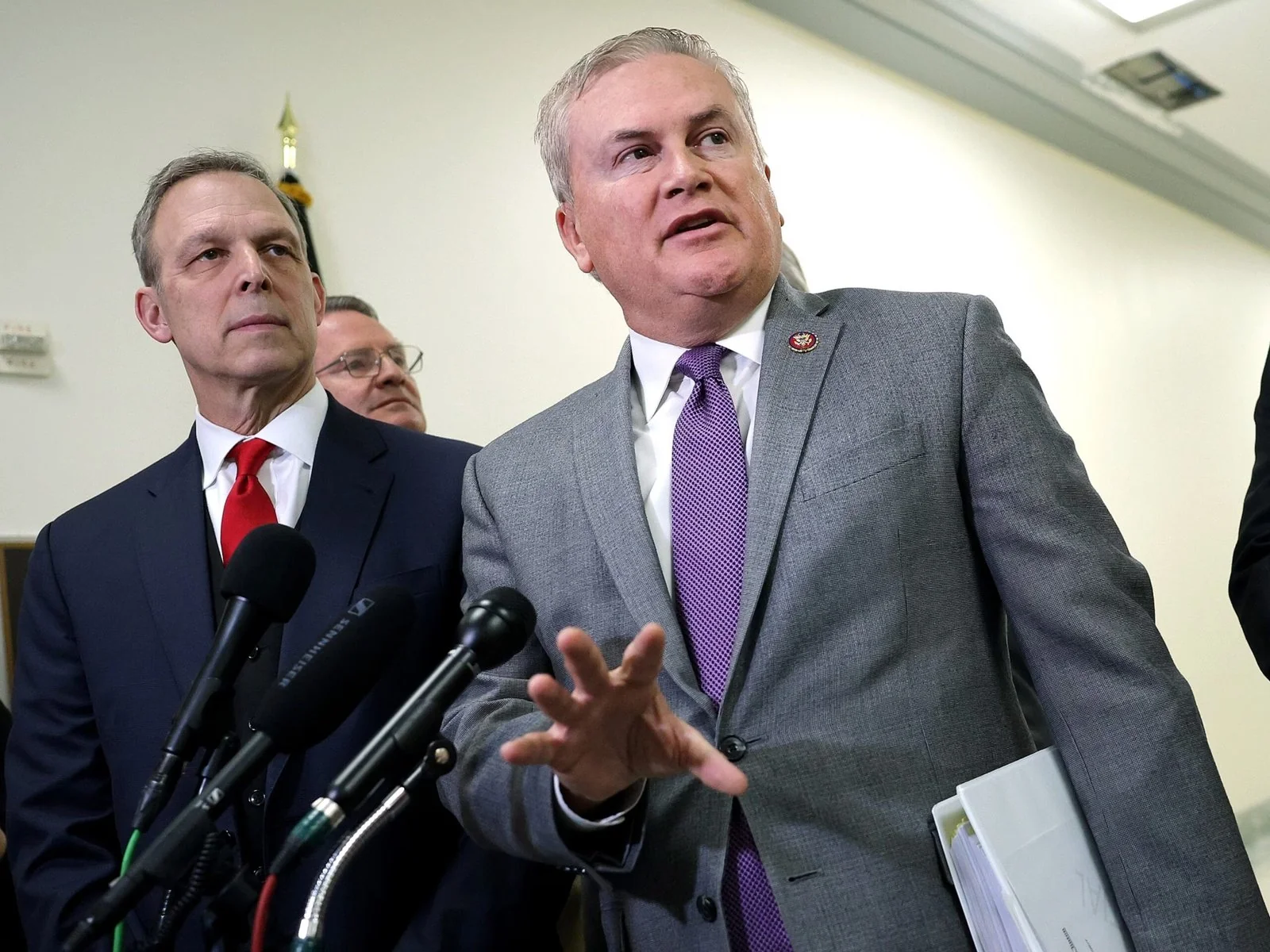 Ketua Komite Pengawasan dan Reformasi Pemerintah DPR James Comer, bergabung dengan Rep. Scott Perry, berbicara kepada wartawan setelah mantan Menteri Luar Negeri Hillary Clinton tidak hadir untuk pernyataan tertutup di Gedung Kantor Rayburn House di Capitol Hill pada 14 Januari 2026, di Washington, DC
