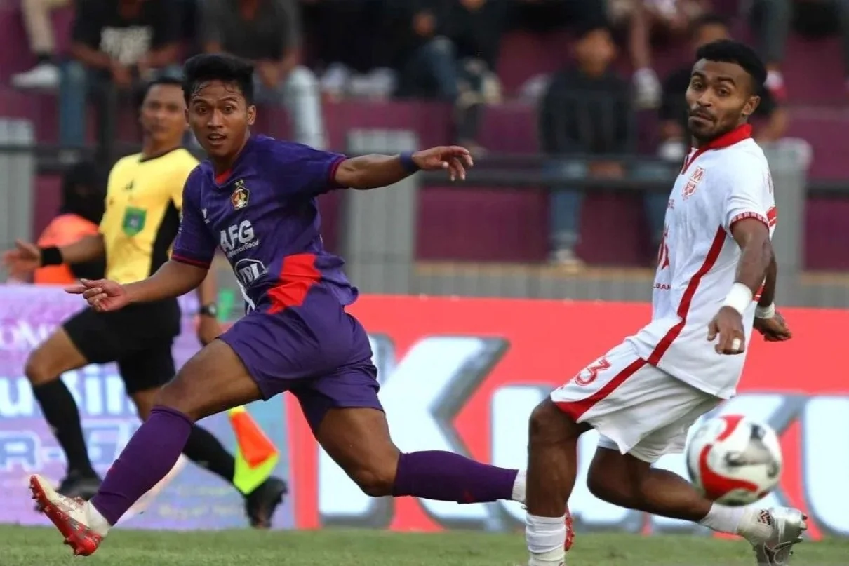 Pesepak bola Persik Kediri Khanafi (kiri) berebut bola dengan pesepak bola Malut United FC Yance Sayuri (kanan) pada Kompetisi BRI Super Organization di Stadion Brawijaya, Kota Kediri, Jawa Timur, Jumat (12/ 9/2025 Pertandingan tersebut dimenangkan Persik Kediri dengan skor 2 – 1 ANTARA FOTO/Fahri Akbar/YU