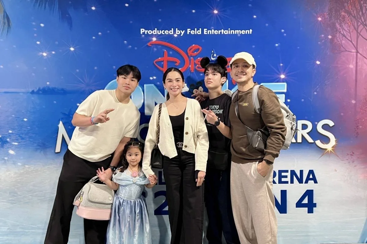 Wynwyn Marquez, juara dunia Miss PH 2025, tampil bersama keluarganya di Disney dengan layar es, menampilkan gambar seni bintang-bintang.