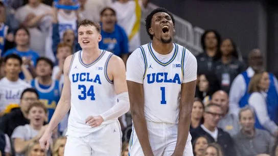 #3 UCLA Bruins merayakan setelah sebuah piring selama pertandingan basket NCAA melawan Purdue Boilermakers, Selasa, 20 Januari 2026, di Los Angeles, California.